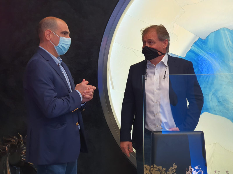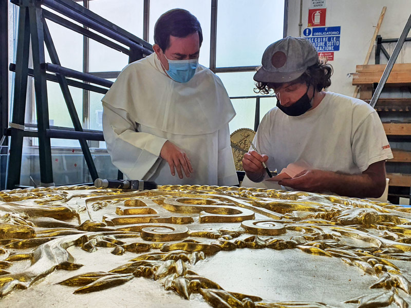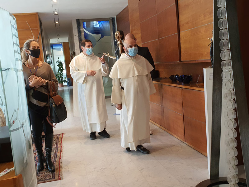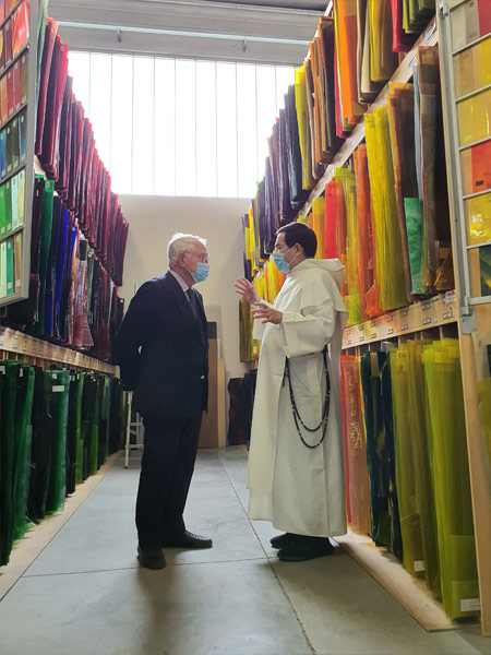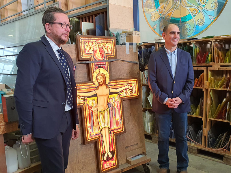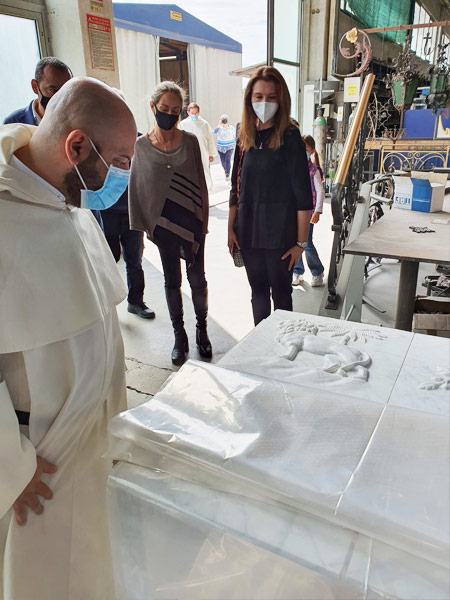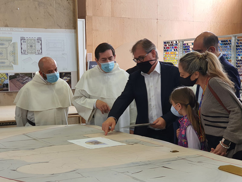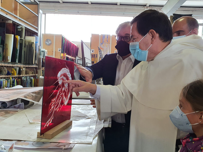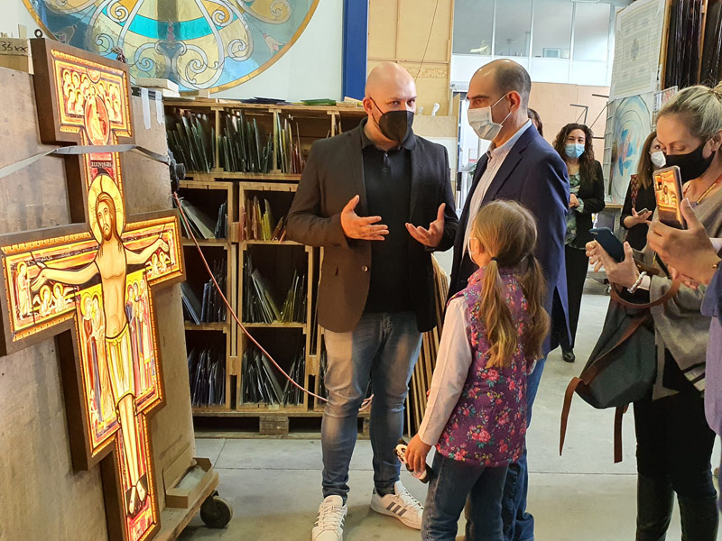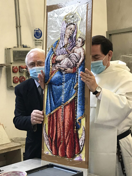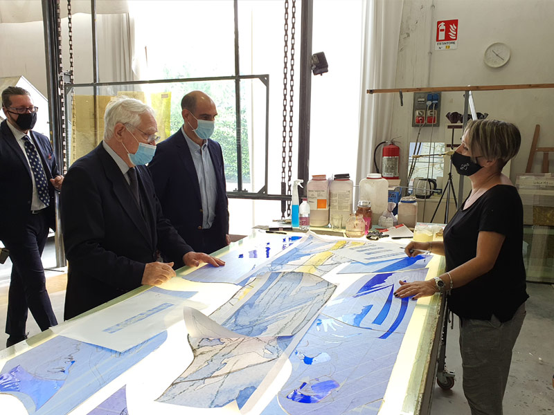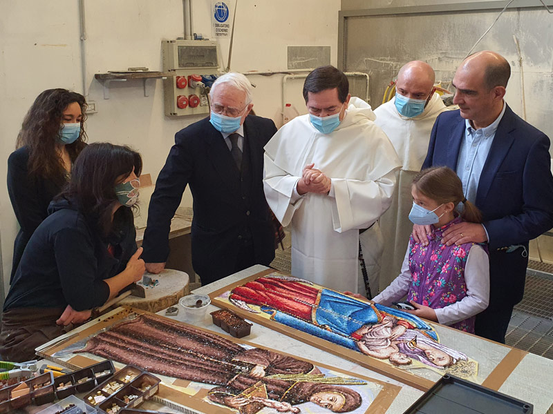 An important meeting has been held today at our workshop. We welcomed Dr. Jorge Mario Eastman, ambassador of Colombia to the Holy See, together with Fr. Orlando Rueda. After many months of isolation, being unable to receive as usual our clients in our studio, we were very excited to meet them. The aim of the visit was to check the progress of the mosaic Our Lady of the Rosary of Chiquinquirá commissioned by the Embassy of Colombia to the Holy See. This mosaic is part of a large-scale project conceived several years ago, for which our studio has already created many Marian theme mosaics for foreign Embassies to the Holy See.